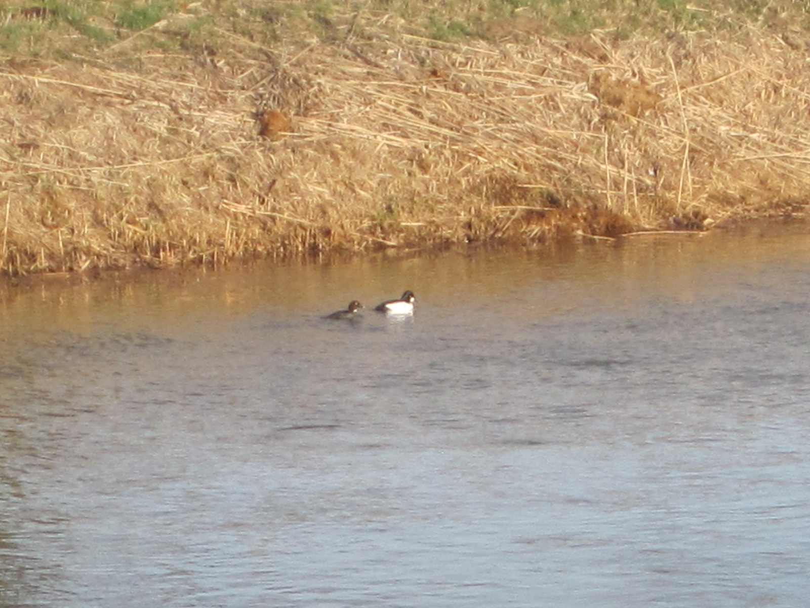 Das Entenpaar sind Schellenten. Sie weilen bei uns als Wintergast. Ihre Heimat befindet sich in Skandinavien. Besonders das Männchen ist als schwarz-weißer Wasservogel gut zu erkennen, der sich nur kurze Zeit auf der Wasseroberfläche aufhält und schnell wieder zur Nahrungssuche abtaucht. Dieser Wechsel findet über längere Zeit ununterbrochen statt und unterscheidet ihn von der ebenfalls schwarz-weißen Reiherente.